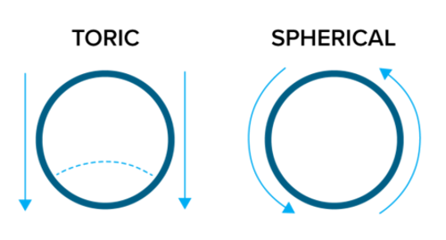 Standard contact lenses have spherical surfaces, imagine them like a slice of a round ball. While toric lenses on the other hand, are shaped in a particular way in which the focusing power is different between vertical and horizontal orientations, now you can think of slicing the side of a donut.