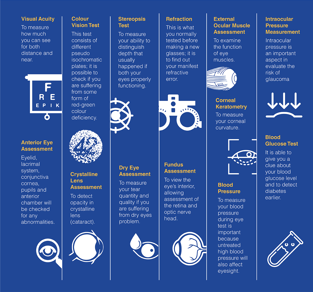 Risk factors include history of eye disease, family history of eye diseases, health issues (diabetes, hypertension), occupational demand (police, army), contact lens wearer, high refractive error, history of eye surgery (LASIK, cataract removal), on medication and so on. It is recommended that these groups of people have their eye exam once a year or as instructed by their optometrist.