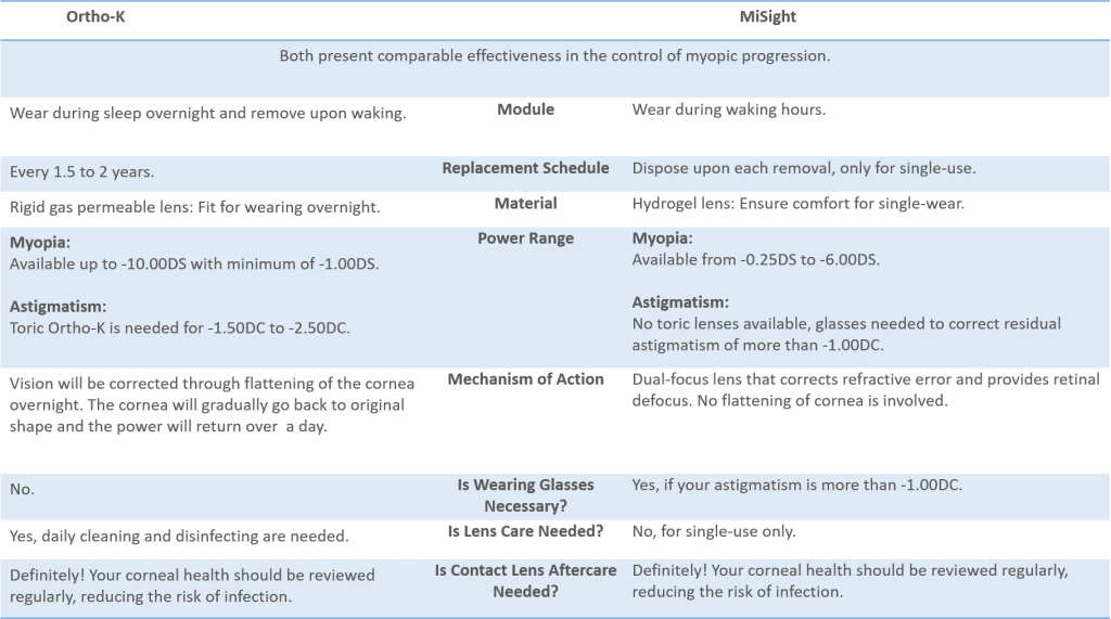 There is hardly a superiority when we compare the effectiveness between Ortho-K and MiSight, both are used to control and slow down the myopic progression. Let us bring you through between both of these anti-myopiagenic contact lenses.