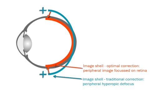 Standard Myopia Correction: Standard glasses or contact lenses correct myopia at the centre of retina, but the image on the peripheral retina is out of focus. In fact, the defocus at the periphery of retina is found to be a stimulus that triggers the increase in myopic progression.