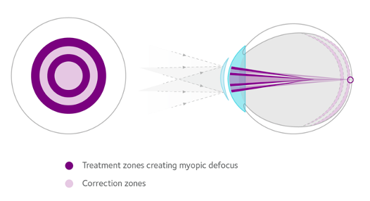 MiSight is regarded as a dual-focus lens, comprising a central correction zone surrounded by a series of alternating treatment (+2.00DS defocus) and correction zones. The power along the correction zones correct the refractive power, while the +2.00DS treatment zones provide retinal defocus. The zone diameters are chosen based on age-appropriate pupil sizes to ensure good distance vision and and the use of accommodation during near work.